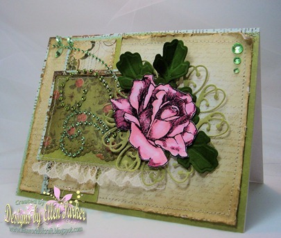 That gorgeous flower is from Inspired by Stamping’s Fancy Flowers set and colored with Copics. The sketch is Operation Write Home’s sketch for this week and lent itself to lovely layers and lace, so I took advantage of that. My MS doily border punch added to the vintage feel, along with the distressed edges. Some Spellbinders and a ZVA Creative flourish finish this card.