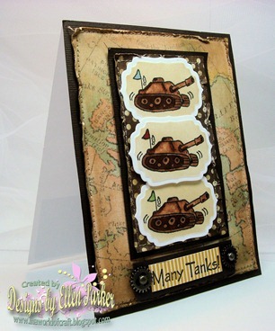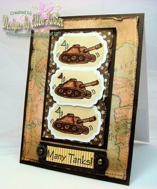 I haven’t used this stamp set in a while, so I decided it would be perfect for this hero’s card! All of the paper is from my scrap pile. The tanks are colored with my Copics and cut using a Spellbinders Labels Four. Two gears help attach the sentiment to the card.