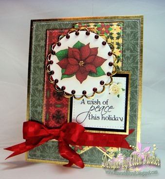 This card was made using Doodle Pantry’s Poinsettia digital stamp set. The beautiful poinsettia, red and yellow papers and the sentiment are all from this set. The ribbon is from RRR and the little white flower is from Inspired by Stamping. I just love the way the gold metallic paper makes this card shine!