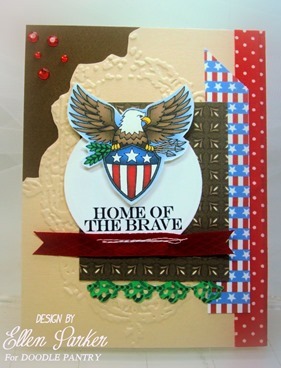(Doodle Pantry Digi: Freedom Eagle – sentiment, image, DSP; red polka dot fabric tape {Inspired by Stamping}, Tim Holtz embossing folder; MS border punch)