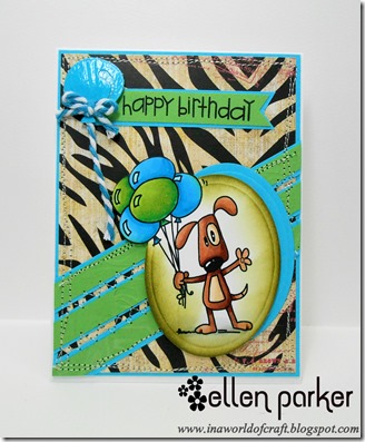 Hi Ellen, congratulations on your last weeks sketch challenge win! I LOVE this card great background paper and colouring of the Pup! Thanks for joining us for Bugaboo's 6th Birthday Bash good luck! Dawn DT.