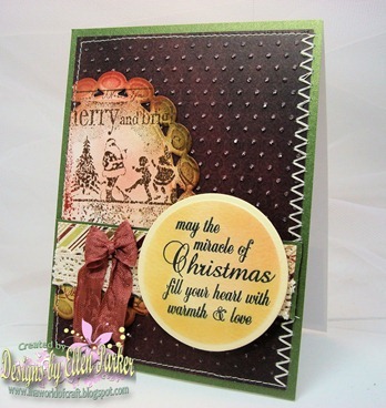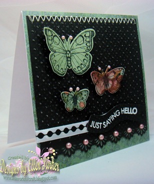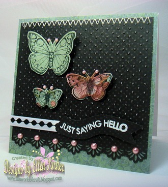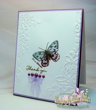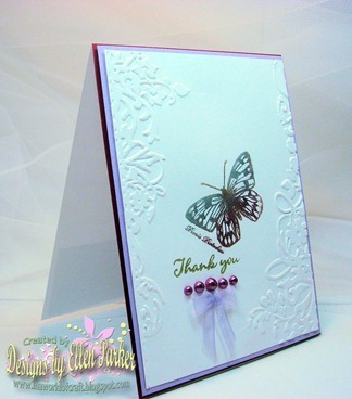 Spellbinders Lacey Squares are under the mouse image which is a Spellbinders standard square. The white panel is embossed with Swiss Dots embossing folder. The sentiment has two corners rounded with a corner rounder and has two purple rhinestones. The image and sentiment are from Sweet N Sassy. I colored the image with Copics.
