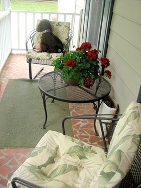 This is our shady front porch with Miss Joy taking a little rest. The red hydrangea is a new hybrid that is a true red and is heat tolerant. It is just beautiful!
